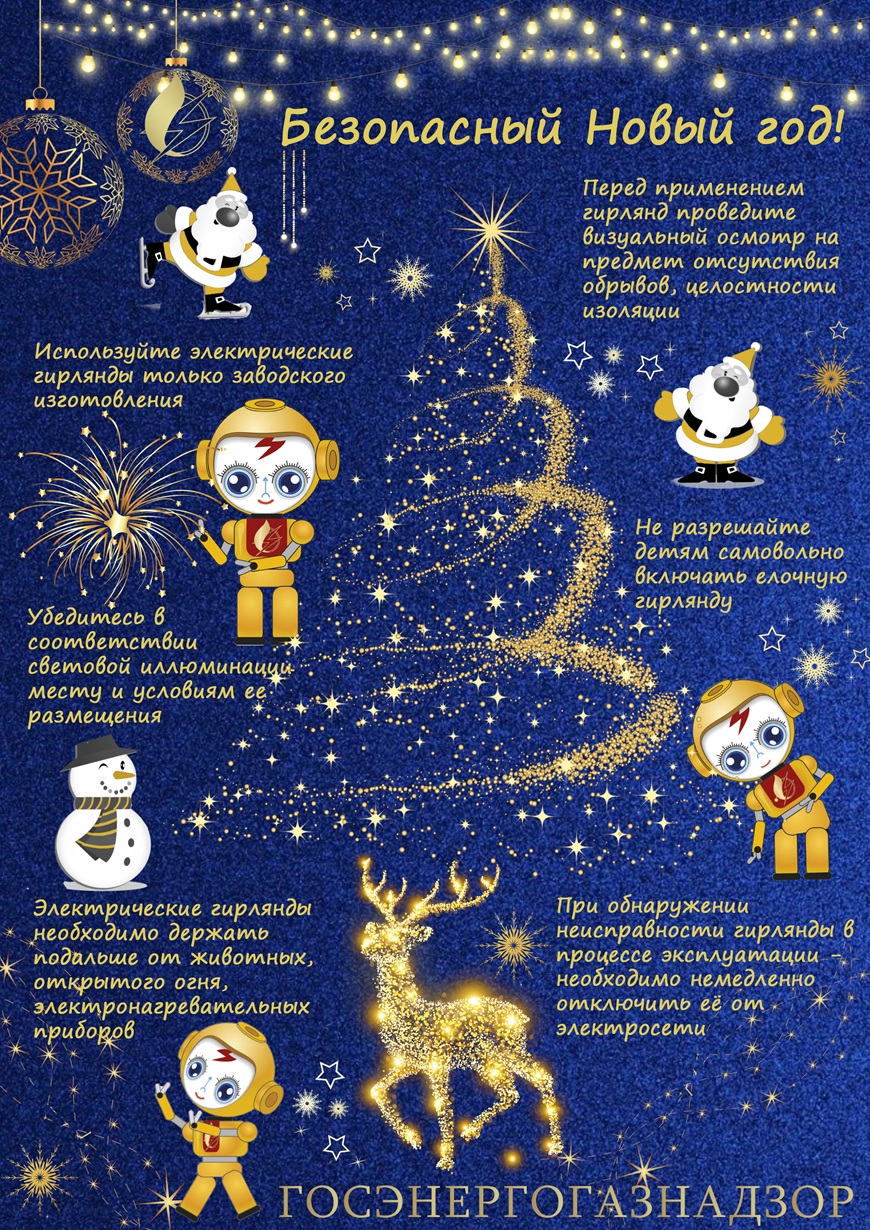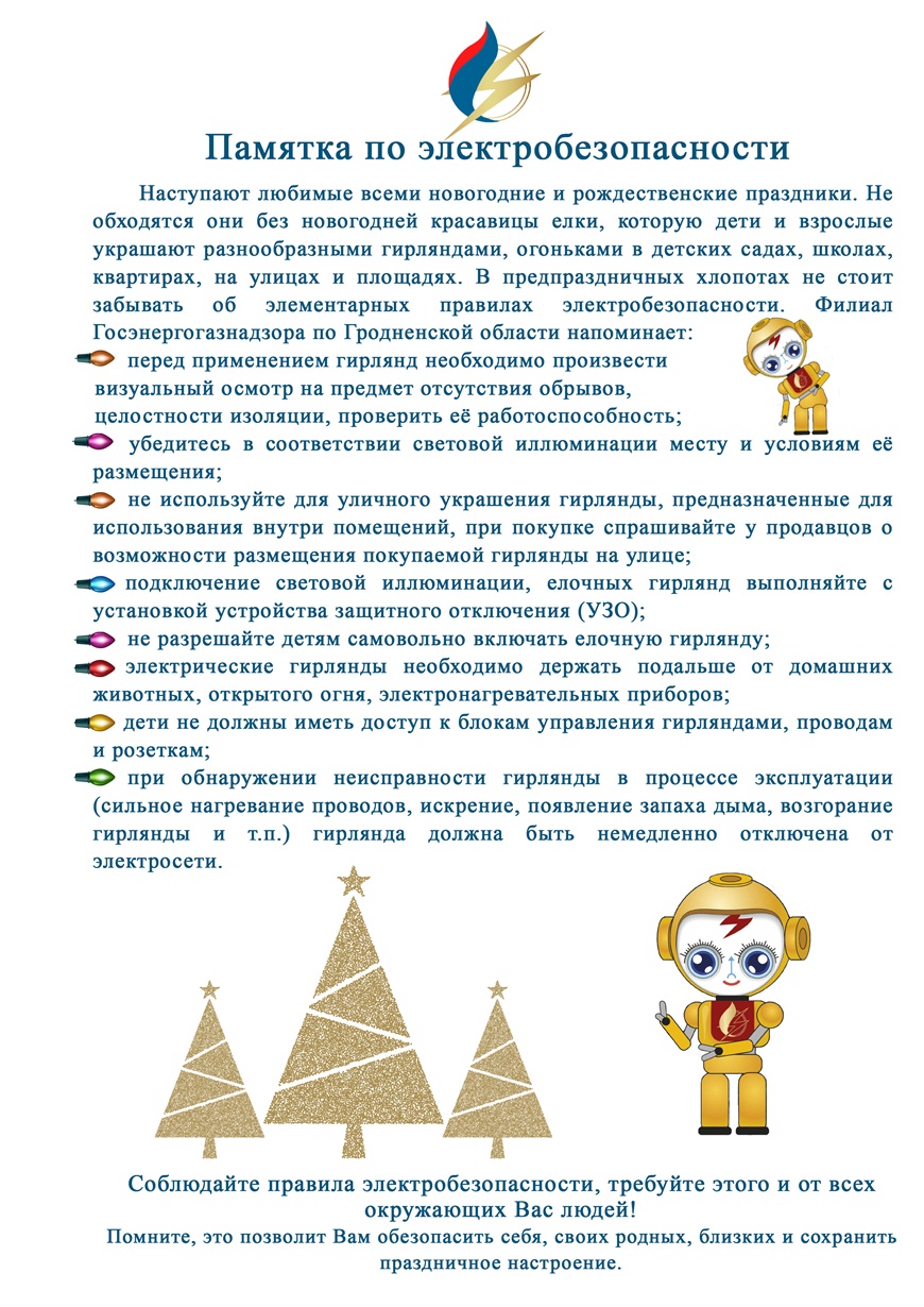 Приближаются рождественские и новогодние праздники. На предприятиях, в магазинах, домах культуры, детских садах и школах производится установка праздничных украшений, сценических площадок, подключение новогодних деревьев и другой праздничной иллюминации. Фасады общественных зданий, витрины магазинов и окна жилых домов начинают сиять разноцветными гирляндами, город раскрашивается праздничными огнями в ожидании праздников. В процессе подготовки и во время праздничных мероприятий необходимо помнить об элементарных вопросах электробезопасности, для того, чтобы праздник не обернулся несчастьем. Напомним основные правила электробезопасности, пренебрежение которыми может привести к несчастному случаю: