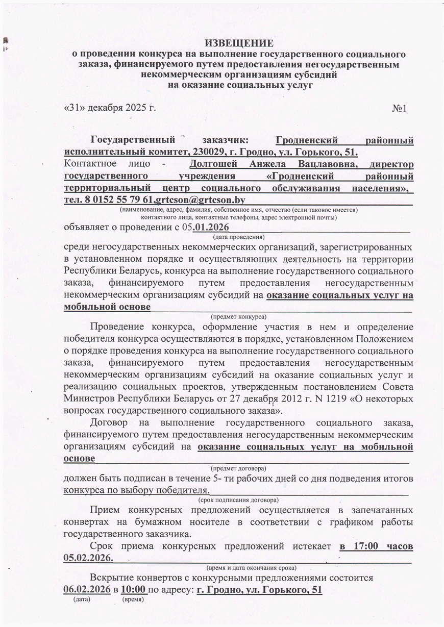 Извещение о проведении конкурса на выполнение государственного социального заказа